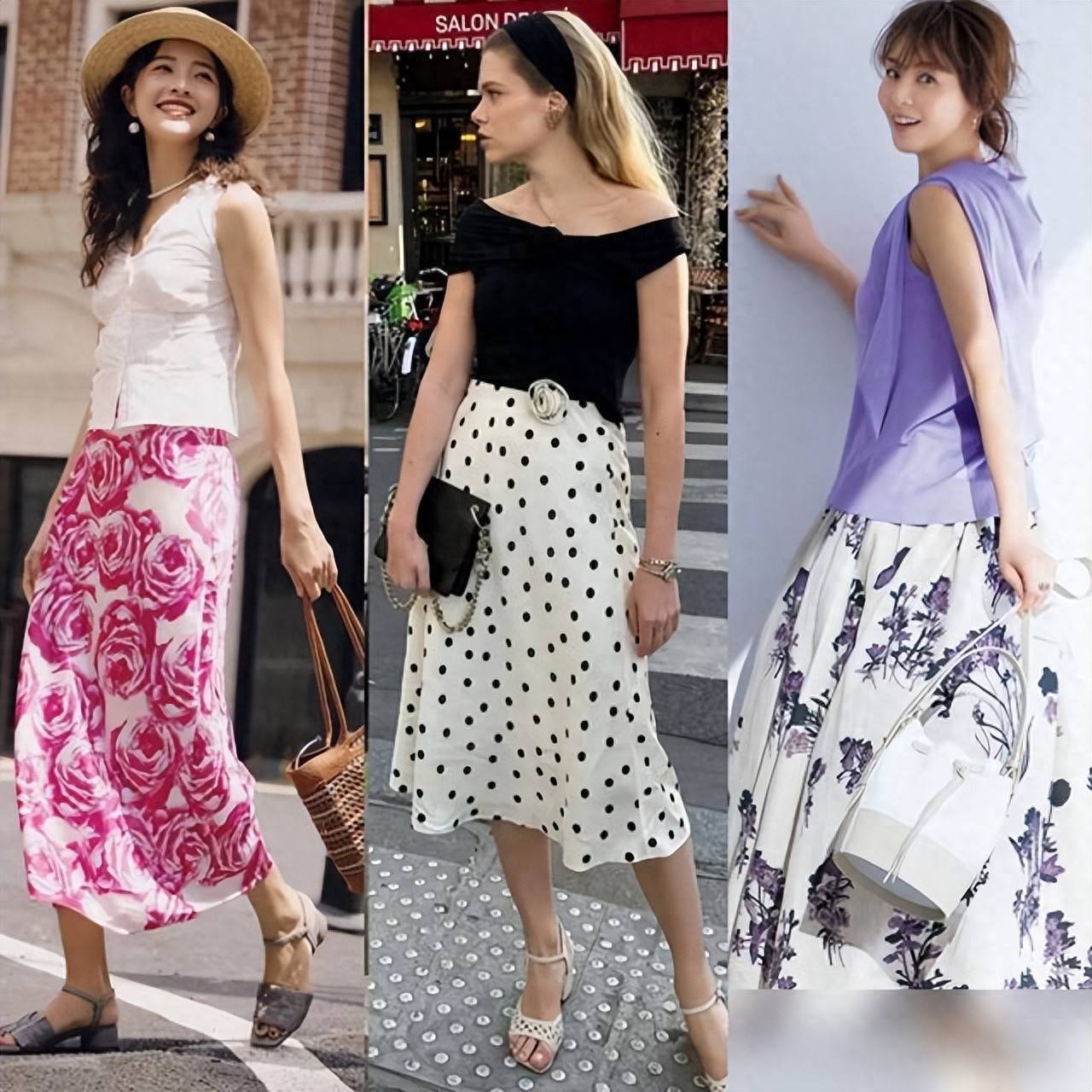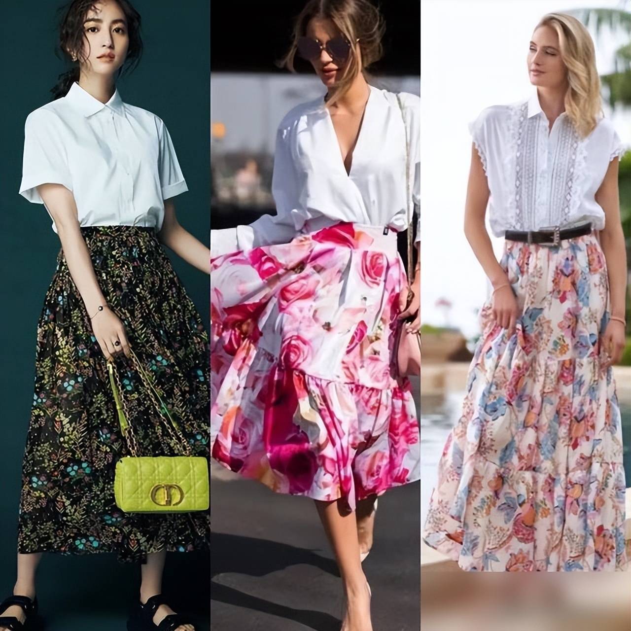 颜色搭配不必刻意追求撞色。同色系搭配更显协调,如浅蓝T恤搭配天空蓝印花裙,或米白衬衫搭配浅咖色印花裙,宛如画中走出。若想尝试亮色,可选低饱和度的玫瑰红、浅草绿等,显白且不刺眼,黄皮也能轻松驾驭。